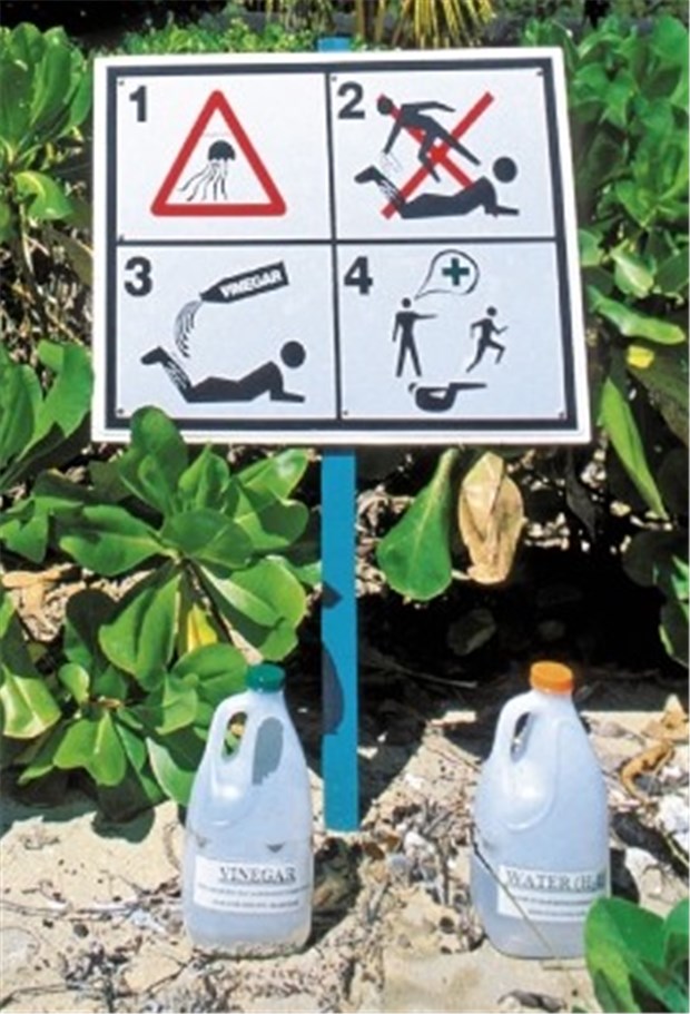 An gefährdeten Stränden gibt es inzwischen oft Warntafeln vor Quallen und Kanister mit Essig.