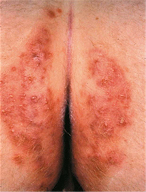 An der rechten Wange des Patienten bestand ebenfalls eine münzgroße juckende und schuppende Plaque. Der Hausarzt hatte es zunächst erfolglos mit Cefuroxim versucht, bevor er den Mann an die Hautärzte überwies. Inzwischen klagte die Partnerin des Mannes ebenfalls über juckende Hautveränderungen.