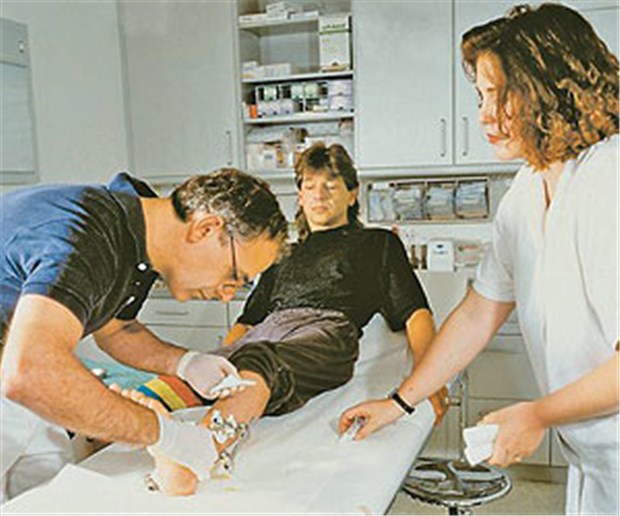 Ein Patient wird nach einer Operation am Bein in einer Praxis nachbehandelt. Erraten Sie in welchem Jahr?