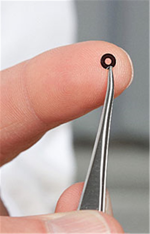 Das nur 3,8 Millimeter kleine Kamra-Implantat sitzt wie eine Lochblende über der Pupille.