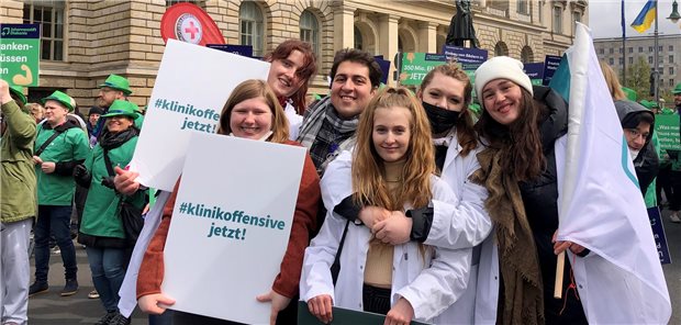 Immer wieder skandierten die Demonstranten ihren Slogan: „Klinikoffensive jetzt!“ und richteten sich dabei direkt an die im Berliner Abgeordnetenhaus sitzenden Politiker. Die Abgeordneten beraten derzeit über den Doppelhaushalt 2022/2023. Bisher sieht der Haushaltsentwurf des Senats 148 Millionen Euro für das Jahr 2022 und 155 Millionen Euro für das nächste Jahr vor.