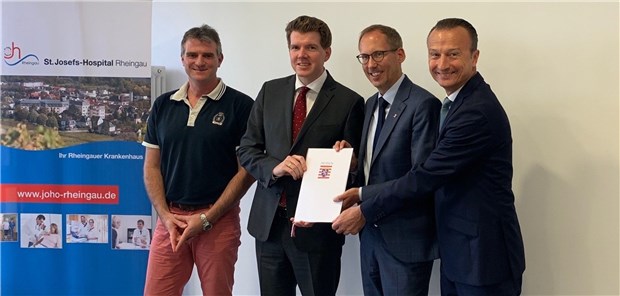 Der designierte Barmer-Landeschef Martin Till mit Sozialminister Kai Klose, Jens Gabriel (Klinikleiter Josefs Hospital Rheingau) und Dr. Ole Waller vom Gesundheitsnetz Rheingau (von rechts) in Rüdesheim.