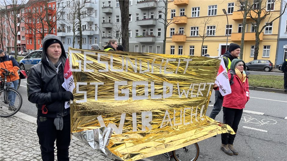Mitarbeiter der Berliner Kliniken demonstrieren für mehr Gehalt und zeigen Zusammenhalt.