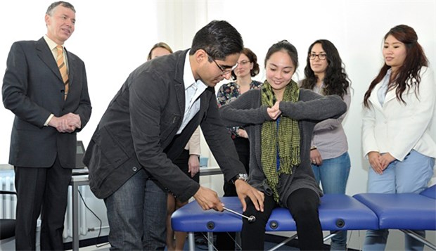 Ein Teilnehmer spielt den Patienten, der andere ist Arzt und arbeitet mit dem Reflexhammer. Es geht um Bizeps- und Trizeps-, um Patellasehnen- und andere Reflexe. Roth erklärt, die Teilnehmer fragen nach, geübt werden Kommunikationssituationen mit Patienten.