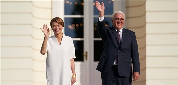 Bundespräsident Frank-Walter Steinmeier und seine Frau Elke Büdenbender begrüßen die Gäste beim Dankesfest im Park von Schloss Bellevue.