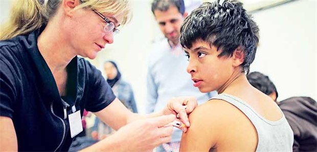 Eine Ärztin impft einen Flüchtlingsjungen aus Syrien im LaGeSo.