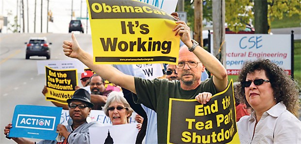 Demonstration im Oktober 2013 in Washington für Obamacare und gegen Kongressabgeordnete, die weitere Kreditaufnahmen verhindern wollten.