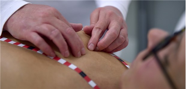 Die Hände von Filiz Demir, blinde Medizinische Tastuntersucherin (MTU) bei Discovering Hands, untersuchen die Brust einer Patientin. Die Klebestreifen dienen der Orientierung und der genauen Ortsbestimmung bei einem Befund.
