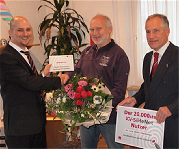Bernd Greve (KBV), Dr. Steininger (20000. Nutzer, Hausarzt aus Darmstadt) und Edgar Pohl, IT-Leiter der KV Hessen.