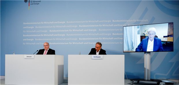 Halb bei der Pressekonferenz in Berlin vor Ort präsent , halb virtuell: Bundeswirtschaftsminister Peter Altmaier (CDU, l.) und Staatssekretär Ulrich Nußbaum (r.) mit Investor Dietmar Hopp (auf dem Bildschirm) und dem Vorstandsvorsitzenden des Biotech-Unternehmens Curevac Dr. Franz-Werner Haas (nicht im Bild).