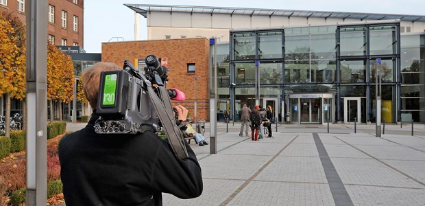 Ein Kameramann filmt den Haupteingang des Klinikums Bremen-Mitte. Nach dem Tod dreier frühgeborener Kinder im Jahr 2011 stand das Krankenhaus lange im Fokus der Öffentlichkeit. Das Vertrauen der Patienten wieder zurückzugewinnen, ist für die Beteiligten eine große Herausforderung.